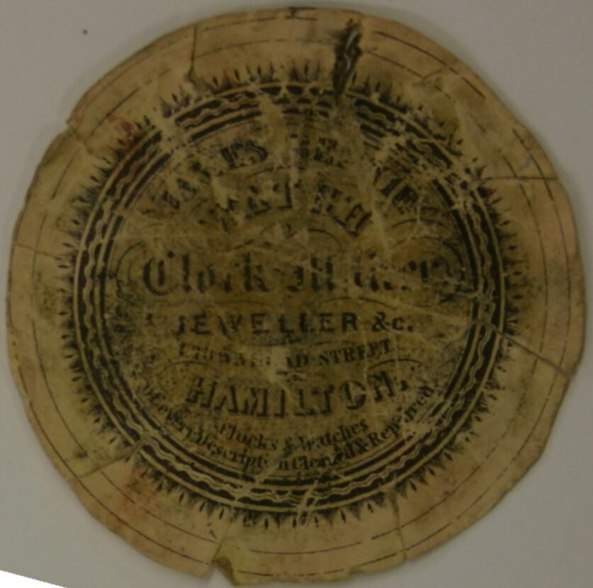 Front, "[Illegible.] / WATCH / Clock Maker / JEWELLER & c. / [Illegible.] street / HAMILTON / Clocks & Watches / [Illegible.]script[Illegible.]&Repaired".". Reverse, handwritten, "[Illegible.] Wilson [Illegible.] / Y[Illegible.] / Glasgow".