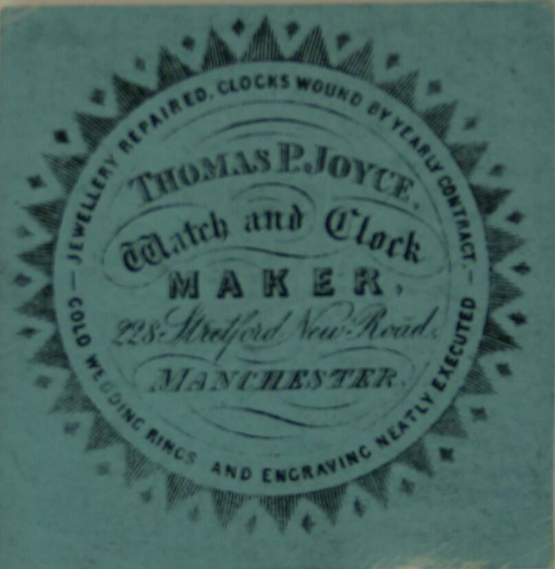 Front, printed, "JEWELLERY REPAIRED. CLOCKS WOUND BY YEARLY CONTRACT. / THOMAS P. JOYCE. / Watch and Clock / MAKER / 228 Stretford New Road / MANCHESTER. / GOLD WEDDING RINGS AND ENGRAVING NEATLY EXECUTED".