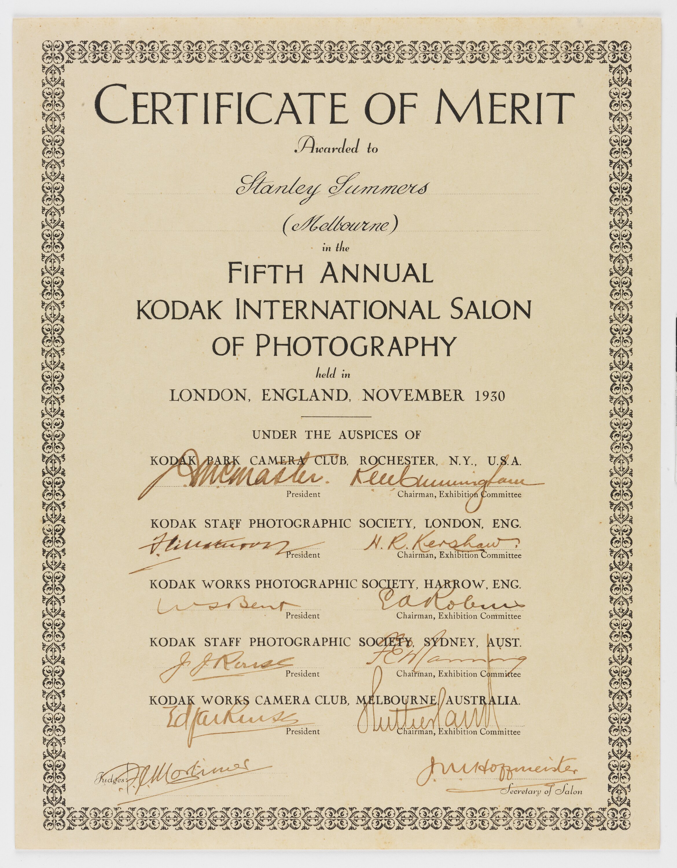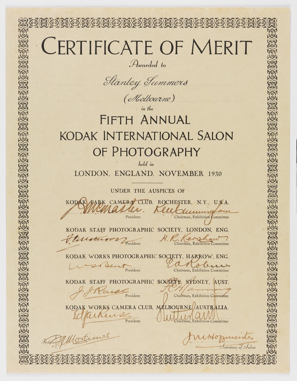 Front, black ink, printed: CERTIFICATE OF MERIT / Awarded to / Stanley Summers / (Melbourne) / in the / FIFTH ANNUAL / KODAK INTERNATIONAL SALON / OF PHOTOGRAPHY / held in / LONDON, ENGLAND, NOVEMBER 1930 / UNDER THE AUSPICES OF / KODAK DARK CAMERA CLUB, ROCHESTER, N.Y., U.S.A. / [brown ink handwritten signature] McMaster [?] [above 'President'] Kell Cunningham [above 'Chairman, Exhibition Committee'] / KODAK STAFF PHOTOGRAPHIC SOCIETY, LONDON, ENG. / [brown ink handwritten signature] ?? [above 'President'] H.R.Kershaw [above 'Chairman, Exhibition Committee'] / KODAK WORKS PHOTOGRAPHIC SOCIETY, HARROW, ENG. / [brown ink handwritten signature] 'Bent'?? [above 'President'] ? Robins ? [above 'Chairman, Exhibition Committee'] / KODAK STAFF PHOTOGRAPHIC SOCIETY, SYDNEY, AUST. / [brown ink handwritten signature] JJ Rouse [above 'President'] FCH Manning [above 'Chairman, Exhibition Committee'] / KODAK WORKS CAMERA CLUB, MELBOURNE, AUSTRALIA / [brown ink handwritten signature] Edgar Rouse [above 'President'] J Sutherland [above 'Chairman, Exhibition Committee'] / [brown ink handwritten signature] D Mortimer [above 'Judges'] JM Hoffmeister [above 'Secretary of Salon'] Front, black ink, printed: decorative border around each side of the certificate.