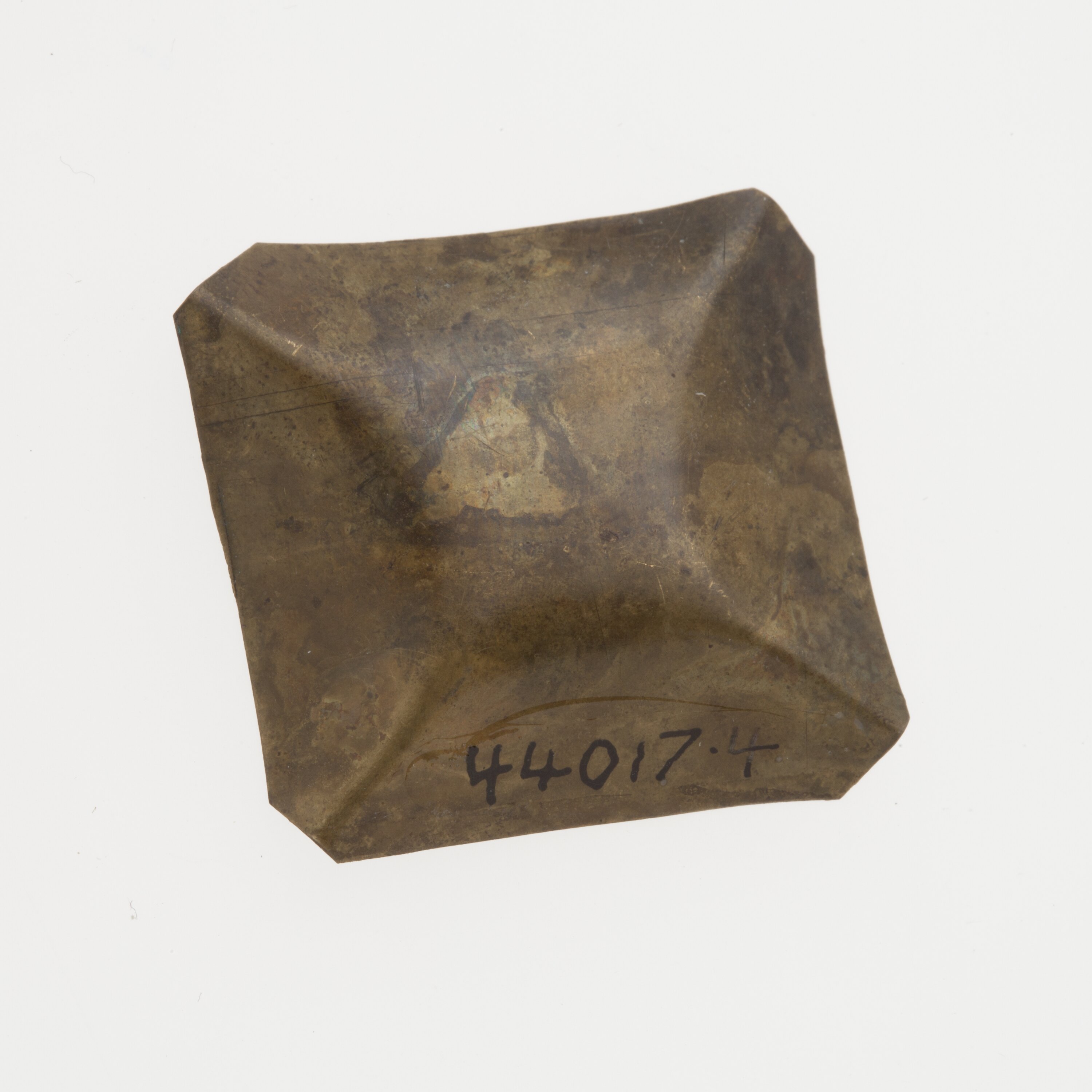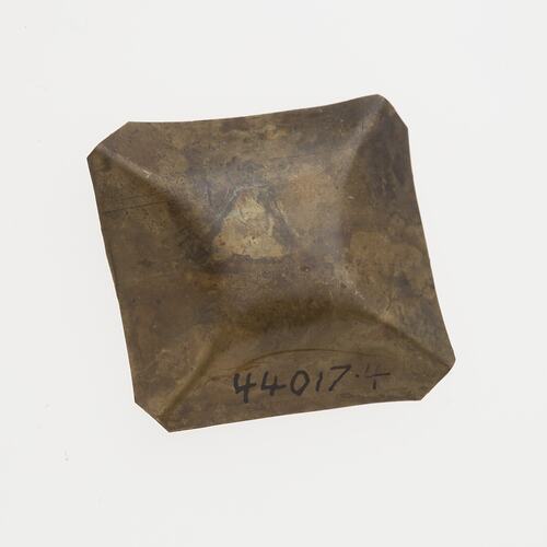 Small square dish made from thin sheet of roughly cut brass. The dish has a shallow square depression in the centre to form a square base.