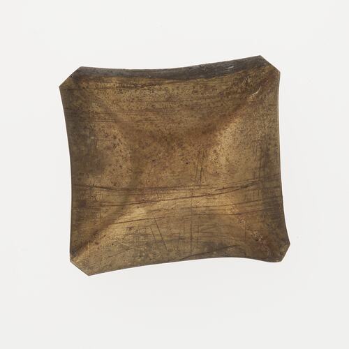Small square dish made from thin sheet of roughly cut brass. The dish has a shallow square depression in the centre to form a square base.