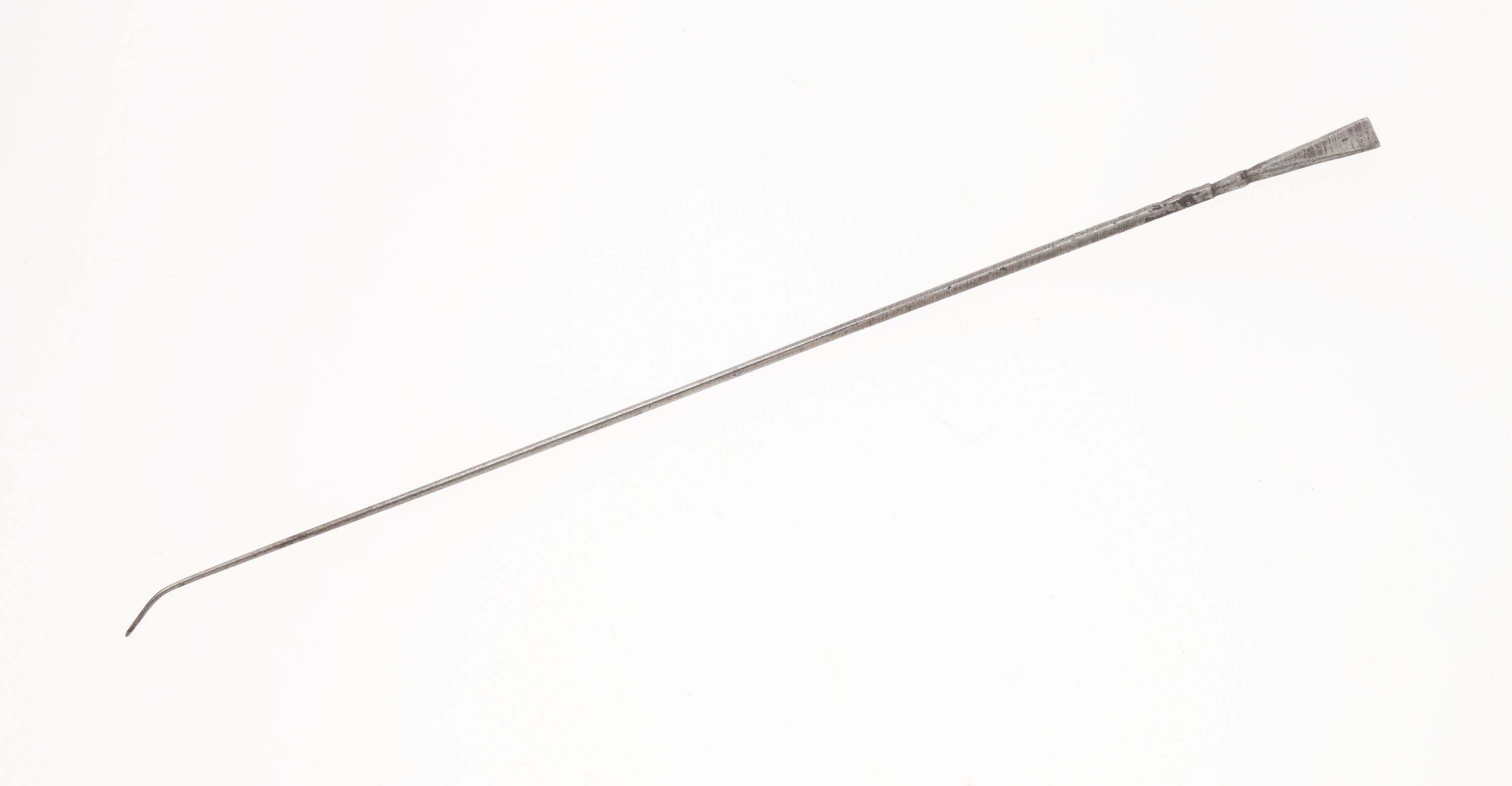Long thin metal rod which has a flattened triangular shaped section at one end and tappers almost to a point at the other. The end which tappers to a point has a slight curve.