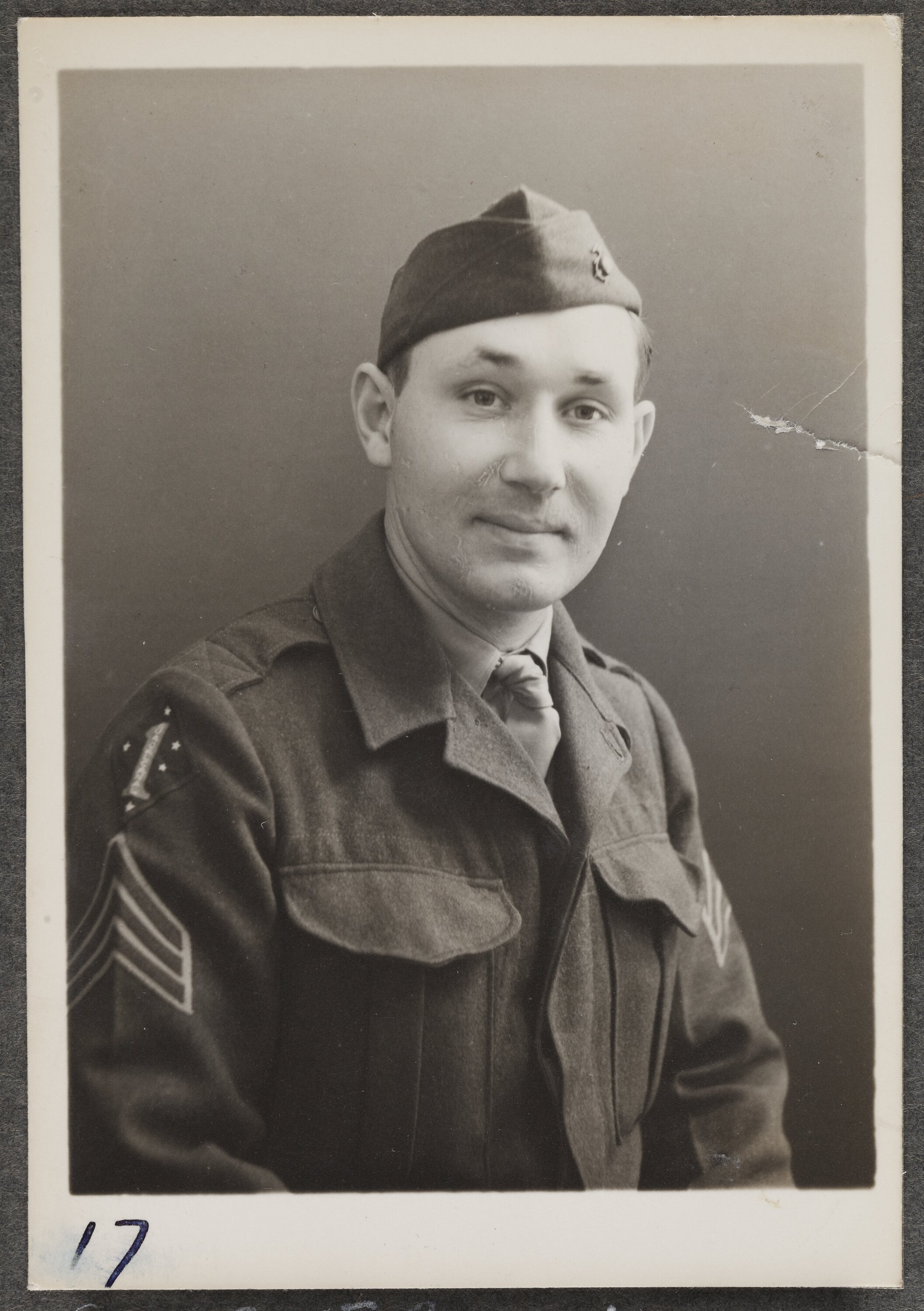 Photographic portrait of Sergeant C.W. Blevino, United States Marine Corps, on a visit to the Kodak factory at Abbotsford.