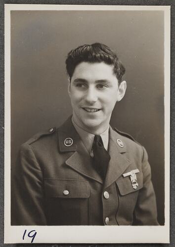 Photographic portrait of Private Bouras on a visit to the Kodak factory at Abbotsford.