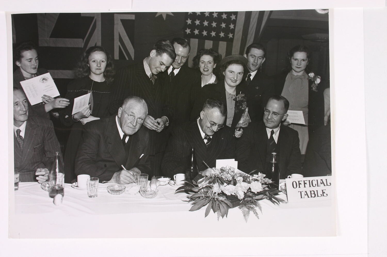 In the photograph two men are signing dinner menus at the official table, with a group of men and women standing behind them. Two other men sit either side of the men at the table. Flowers, bottles, ashtrays, glasses and teacups sit on the table, and Australian and American flags hang behind the group on the wall.