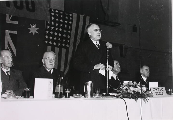 Black and white, silver gelatin photograph of a speech being made at a Kodak presentation dinner in Sydney to welcome home those Kodak employees who had served in World War II, 1946-1947.