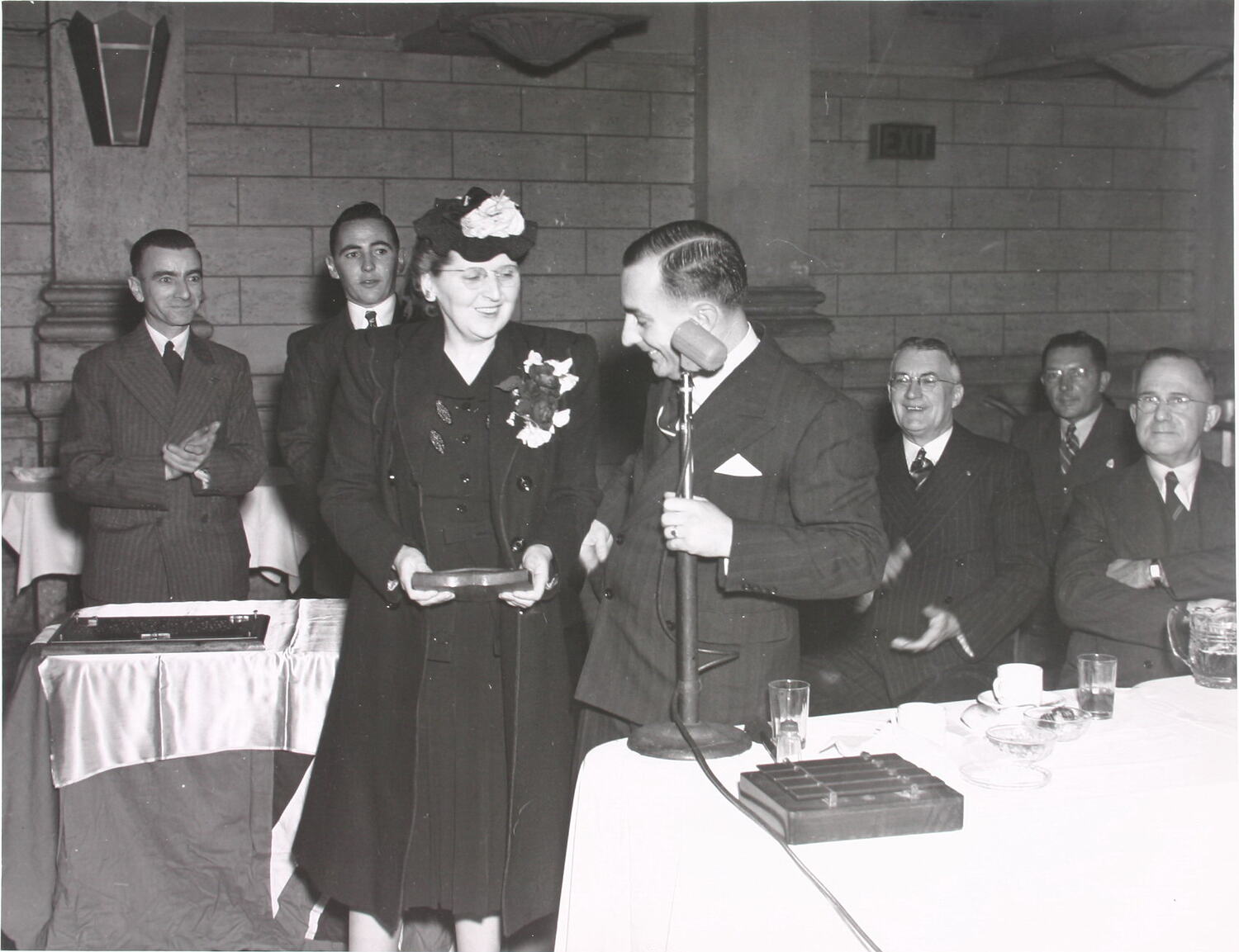 A woman holds a plaque which a man at a microphone has presented her with. They stand behind a table on which the microphone, jug, glasses and tea cups sit. There are five men visible in the background. The setting is indoors and a flash has been used.