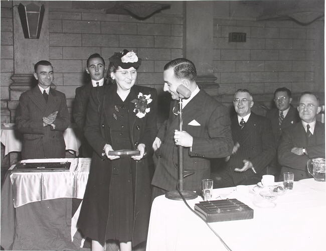 Black and white, silver gelatin photograph of a plaque being presented to a man at a Kodak presentation dinner in Sydney to welcome home those Kodak employees who had served in World War II, 1946-1947.