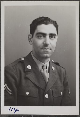 Photographic portrait of Corporal Frank Massara on a visit to the Kodak factory at Abbotsford.