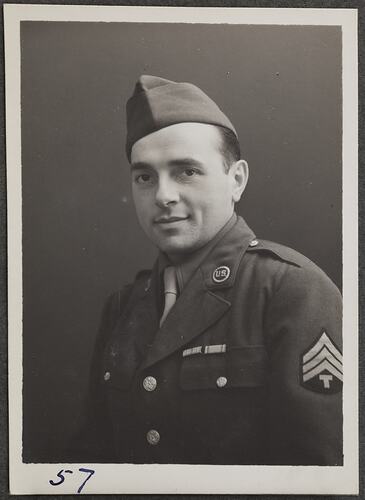 Photographic portrait of Sergeant Farone, United States Army Technician 4th Grade, on a visit to the Kodak factory at Abbotsford.