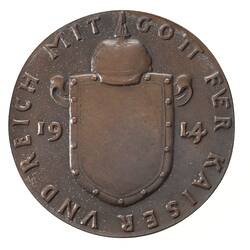 Reverse features a shield dividing the date '1914' surmounted by a German military helmet. Text around reads: 'MIT GOTT FVER KAISER VND REICH' (With God for Emperor and Empire).