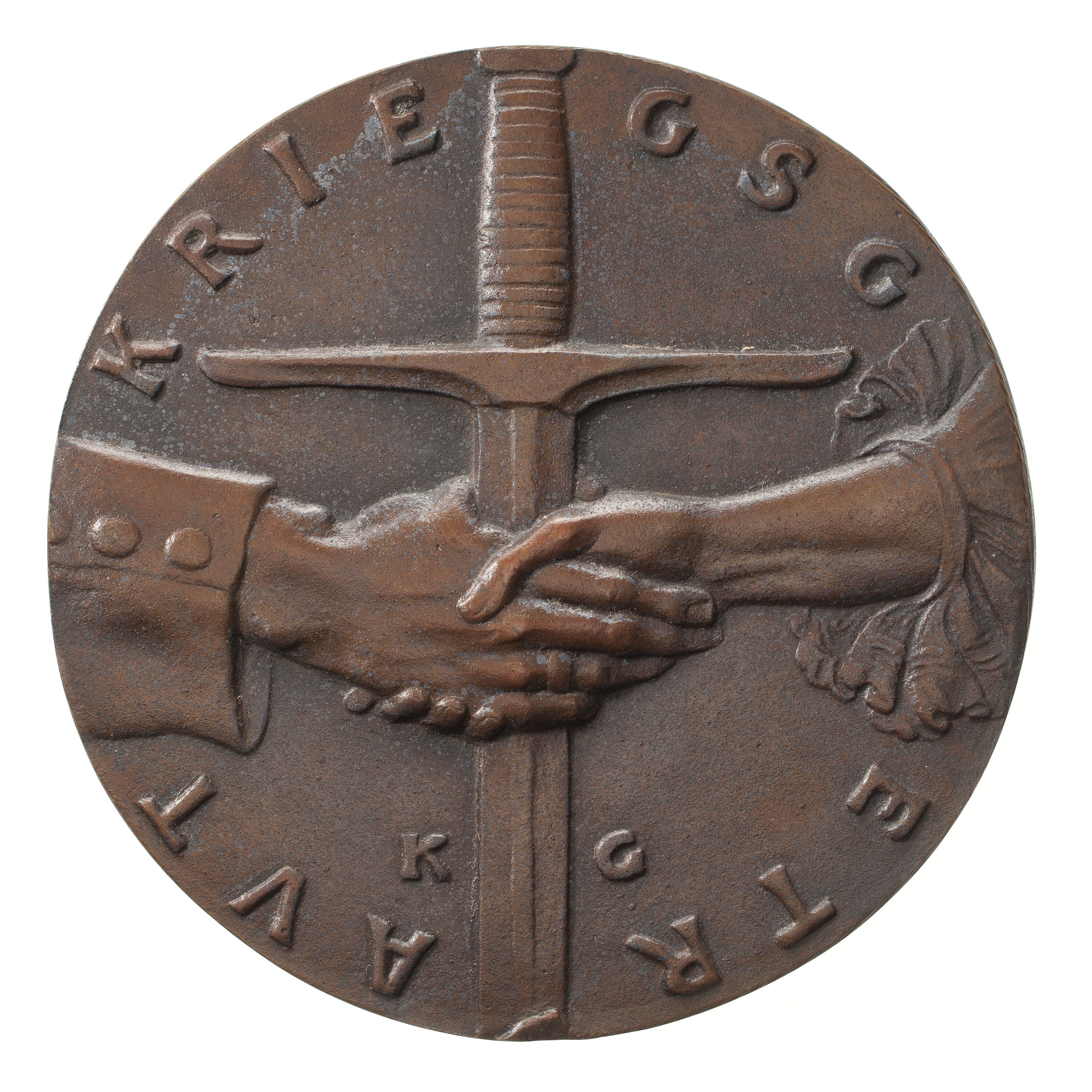 Male and female hands clasped with a vertical sword thrust between them; the sword divides the artist's initials, 'KG'. Text around reads: 'KRIEGSGETRAVT' (Married in War).