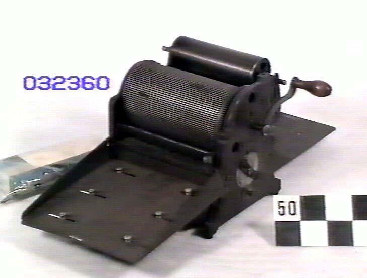 Consists of grooved cylinder drum in which type can be slotted. Inking was either through the broad spooled ribbon for "typewritten" form letters, or with printing ink applied to the rollers, for regular printing. Line length is 7.25 inch. paper feed and recovery plates are demountable. with spare ribbon, parts, and user's manual (see TL 34684).