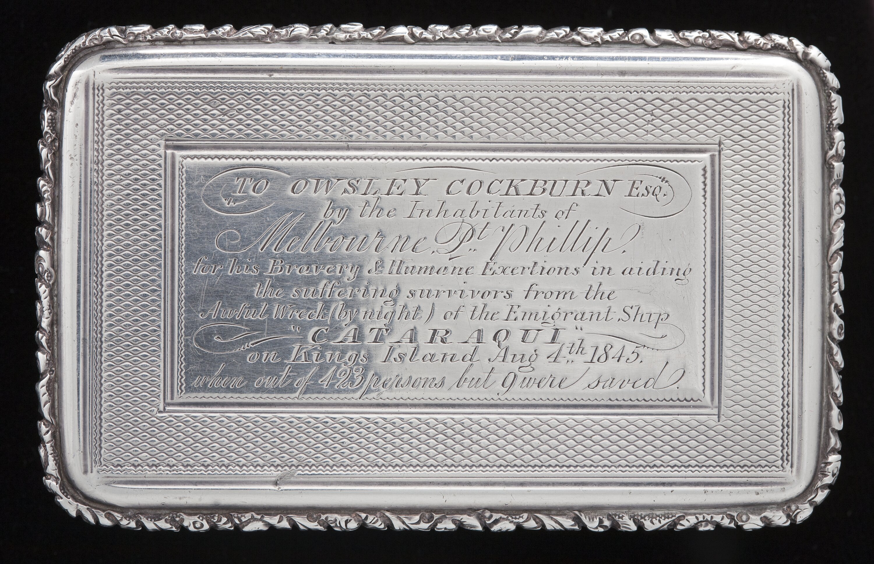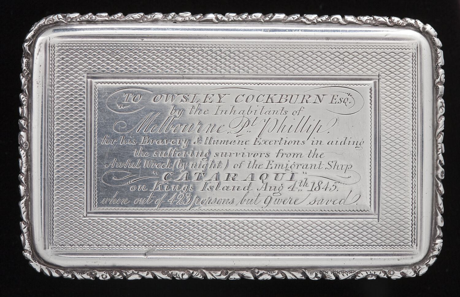 Engraved on lid: "TO OWSLEY COCKBURN ESQ / by the inhabitants of / Melbourne Pt. Phillip / For his Bravery and Human Exertions in aiding / the suffering survivors from the / Awful wreck (by night) of the Emigrant Ship / "CATARAQUI" / on Kings Island, August 4th 1845 / when out of 423 persons but 9 were saved".