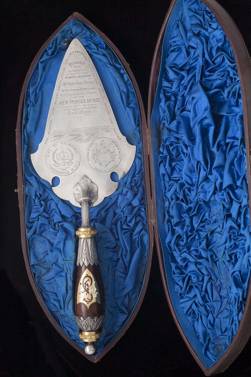 Engraved on blade of trowel: "Presented to the WIFE / of the Right Worshipped / THE MAYOR OF MELBOURNE / Mrs James Cooper Stewart / ON THE OCCASION OF HER LAYING / THE FOUNDATION STONE / OF THE / NEW PRINCE'S BRIDGE / 7th September 1886 Her Birthday /BY THE CONTRACTOR FOR WORK / David Munro" Engraved as a border around the blade of the trowel: "SHIRE OF MOORABBIN / SHIRE OF MALVERN / BOROUGH OF ST KILDA / CITY OF SOUTH MELBOURNE / CITY OF PRAHRAN / BOROUGH OF BRIGHTON / SHIRE OF CAUFIELD" Engraved beneath presentation text: "CITY OF MELBOURNE INCORPORATED AD 1842" and "VICTORIA DEI GRATIA / BRITTANIAR REG F.D. / COLONY OF VICTORIA". Engraved on silver plate on lid of case: "PRESENTED TO / The Mayoress Mrs J. C. Stewart / BY / David Munro". Marked on label on underside of case: "H. Newman / Watchmakers and Jewellers / 123 Elizabeth Street" also "Fielder & Co / 8 Franklin Street W".