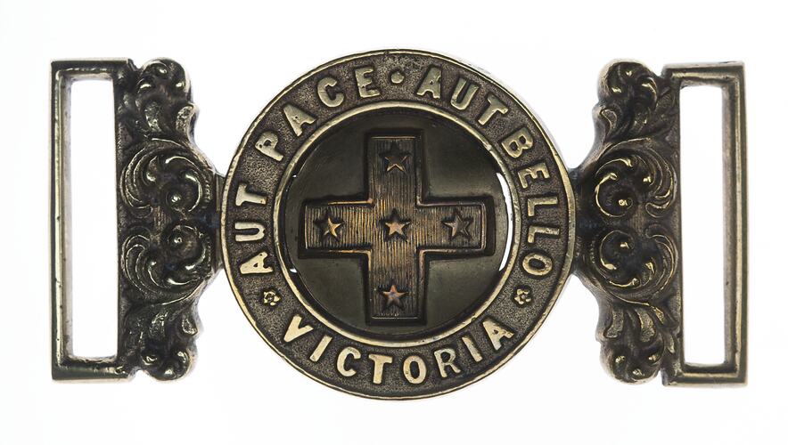 Belt buckle worn by Major Alfred Blannin, an officer in the Victoria Local Forces.