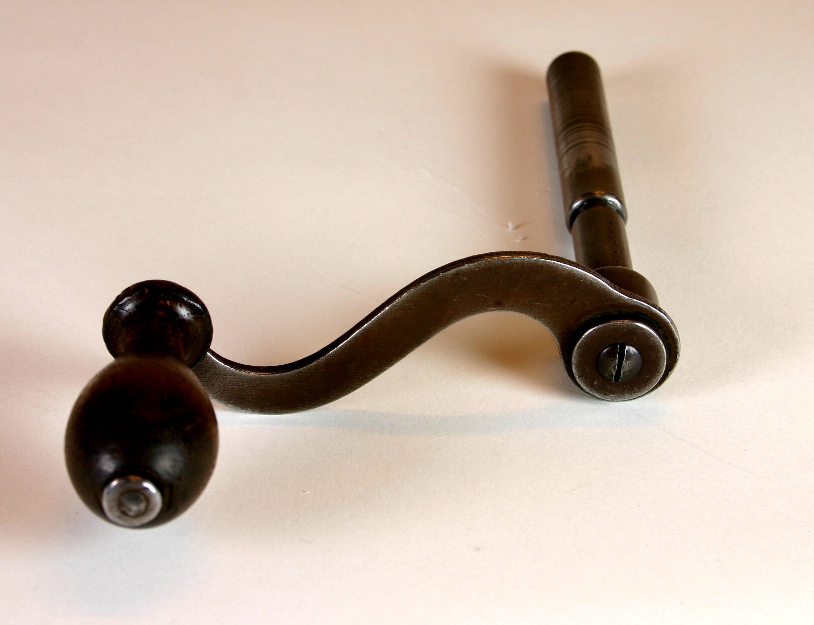 Metal winding handle with wooden knob and brass detail. Shaft to which knob is attached is curved.