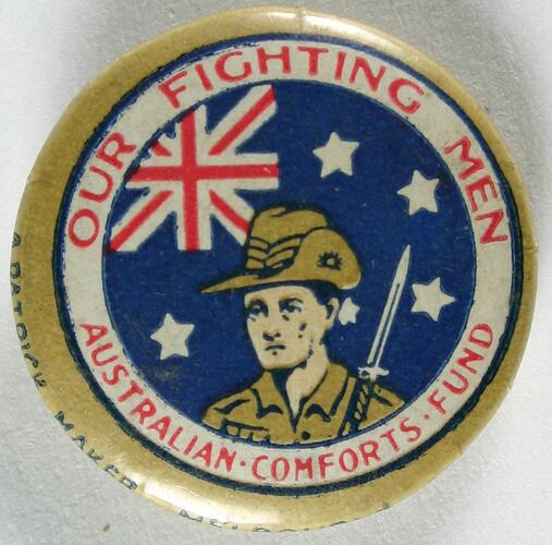Lapel badge or button, otherwise known as a fundraising or patriotic badge, "Our Fighting Men", produced for the Australian Comforts Fund. The badge was made by A. Patrick, who had branches in Melbourne, Sydney and Adelaide.