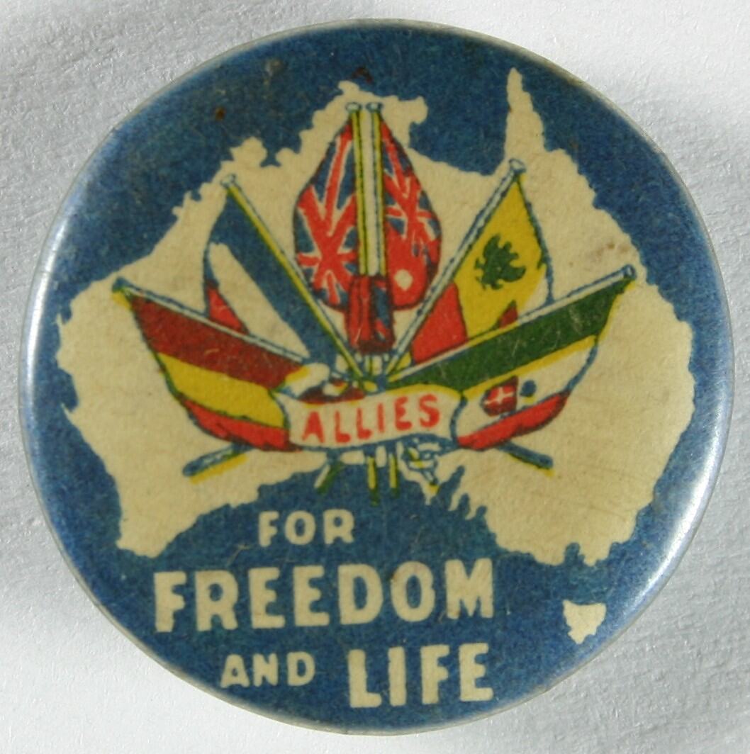 Circular pressed metal badge with a plastic covered obverse, and a metal back with an attached pin. Printed text and an illustration appears in white, blue, red, yellow and green ink on the obverse. In the centre, a scroll with red text sits in front of a group of six flags, with a white map of Australia on a blue background. White text appears underneath the map of Australia on the obverse. White text appears on the bottom edge, but is obscured by a fold where the obverse was pressed into the metal back. The badge is discoloured and soiled. There are brown stains on the obverse. The metal back of the badge is tarnished, and the original silver coloured coating has almost completely been worn away.