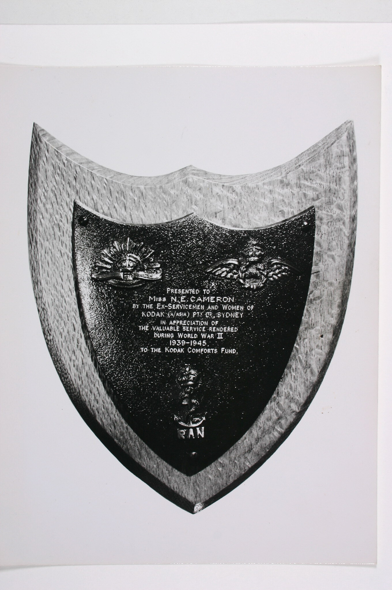 This photograph features a shield shaped plaque presented circa 1945-1946 to Miss Nell Cameron by the ex-servicemen and women of Kodak Australasia Sydney branch, for the "valuable service rendered" to the Kodak Comforts Fund during World War II.
