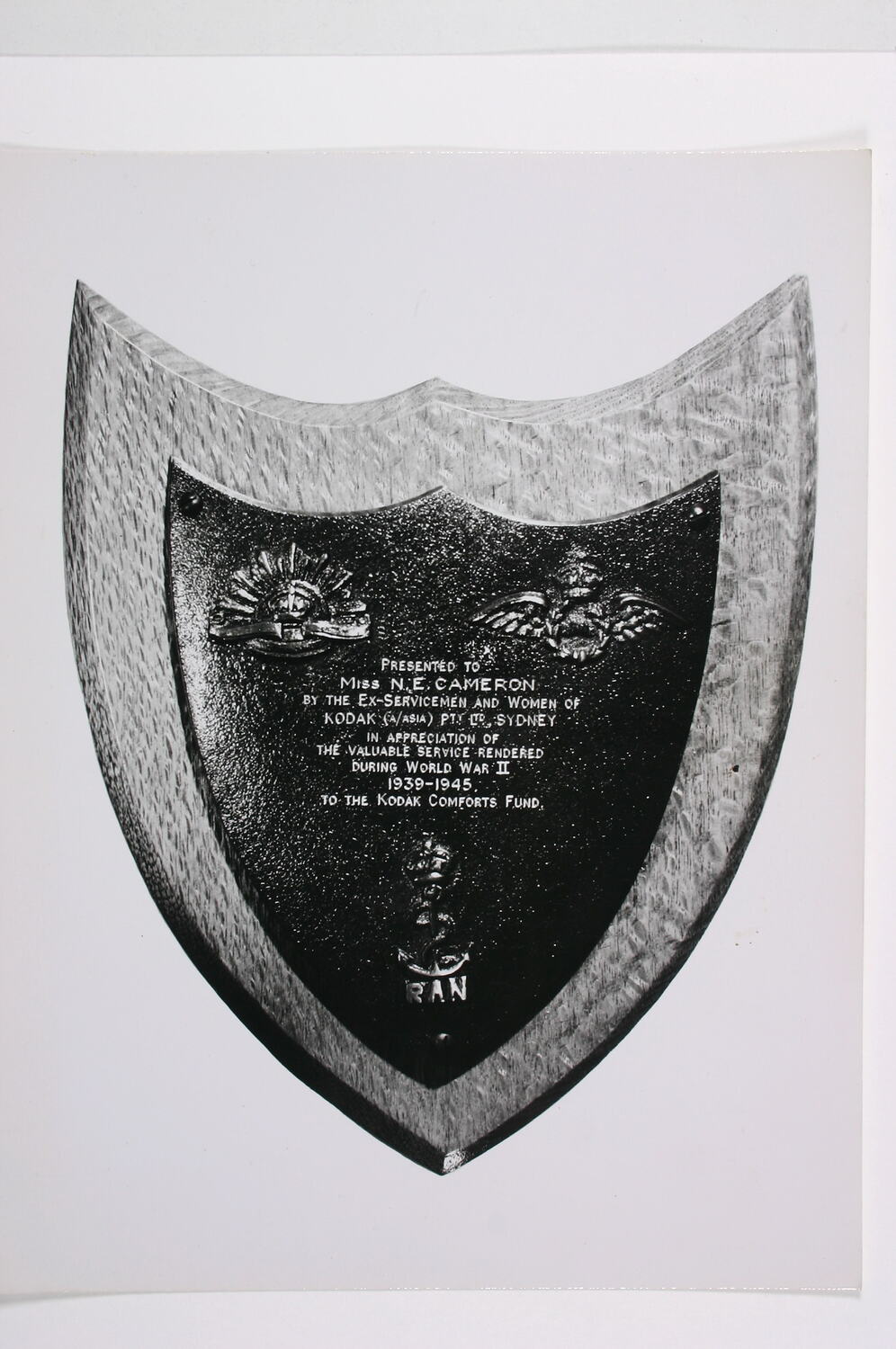 On photograph, image of engraving on front of plaque: LOGOS, "PRESENTED TO / Miss N.E. CAMERON / BY THE EX-SERVICEMEN AND WOMEN OF / KODAK (A/ASIA) PTY LTD SYDNEY / IN APPRECIATION OF / THE VALUABLE SERVICE RENDERED / DURING WORLD WAR II / 1939-1945 / TO THE KODAK COMFORTS FUND" / LOGO / "RAN"