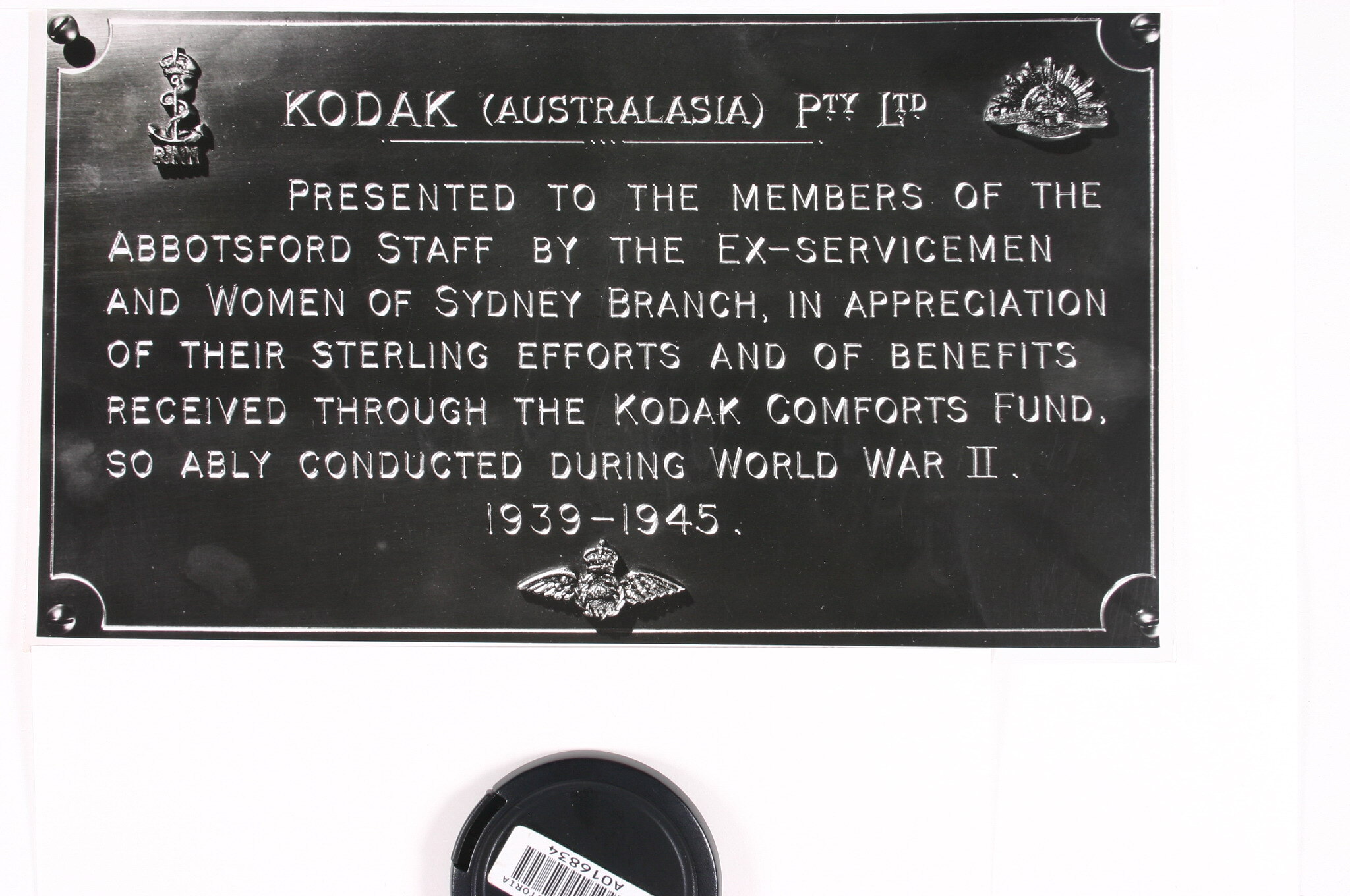 This photograph features a rectangular plaque presented by the ex-servicemen and women of Kodak Australasia Sydney branch to the Abbotsford staff of Kodak Australasia, for their "sterling efforts" providing assistance through the Kodak Comforts Fund during World War Two.
