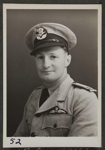 Photographic portrait of Flying Officer W. Gay of Abbotsford on a wartime visit to the Kodak factory at Abbotsford.