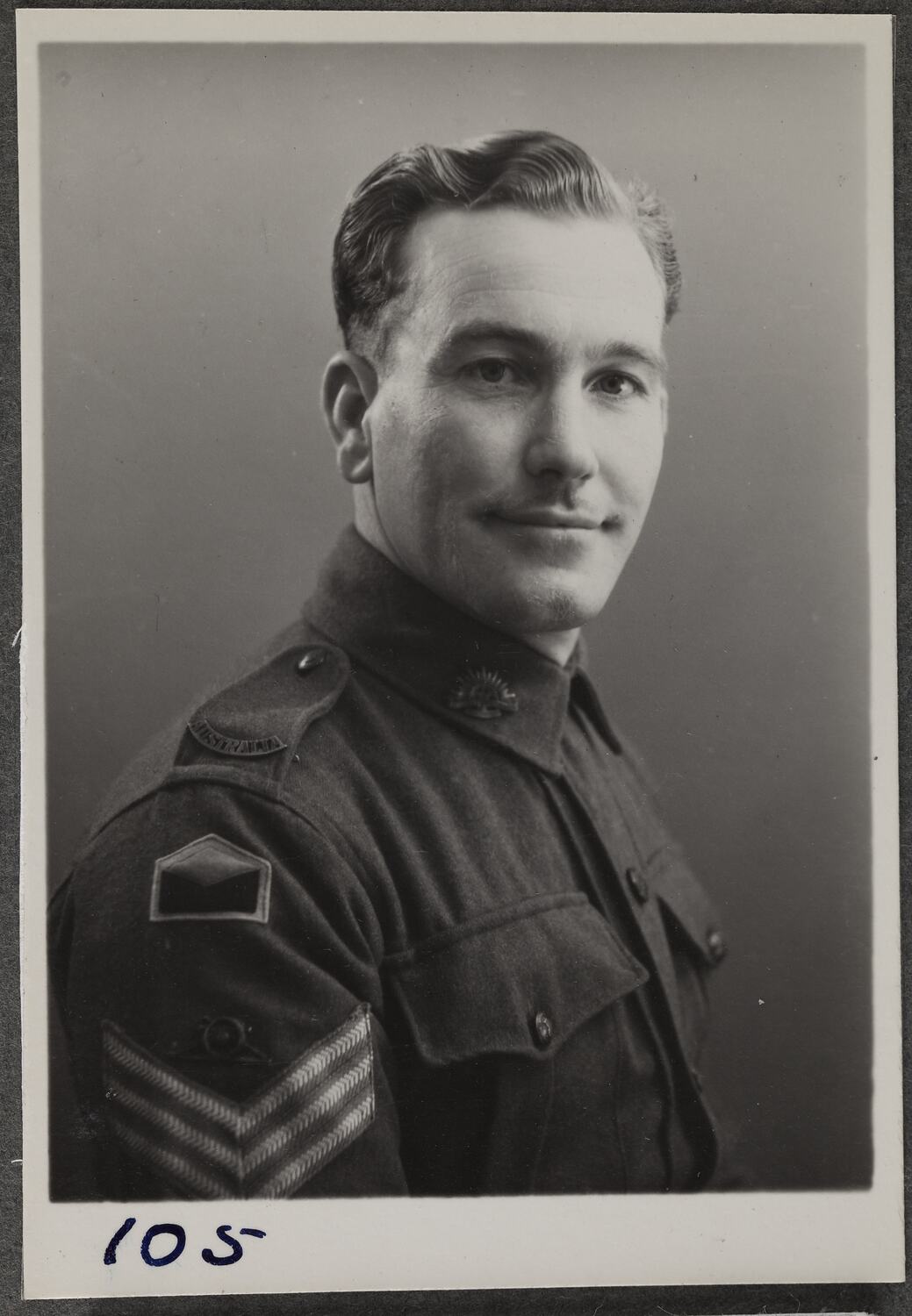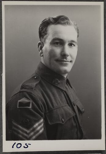 Photographic portrait of Sergeant W.E. Martin of Abbotsford on a wartime visit to the Kodak factory at Abbotsford.