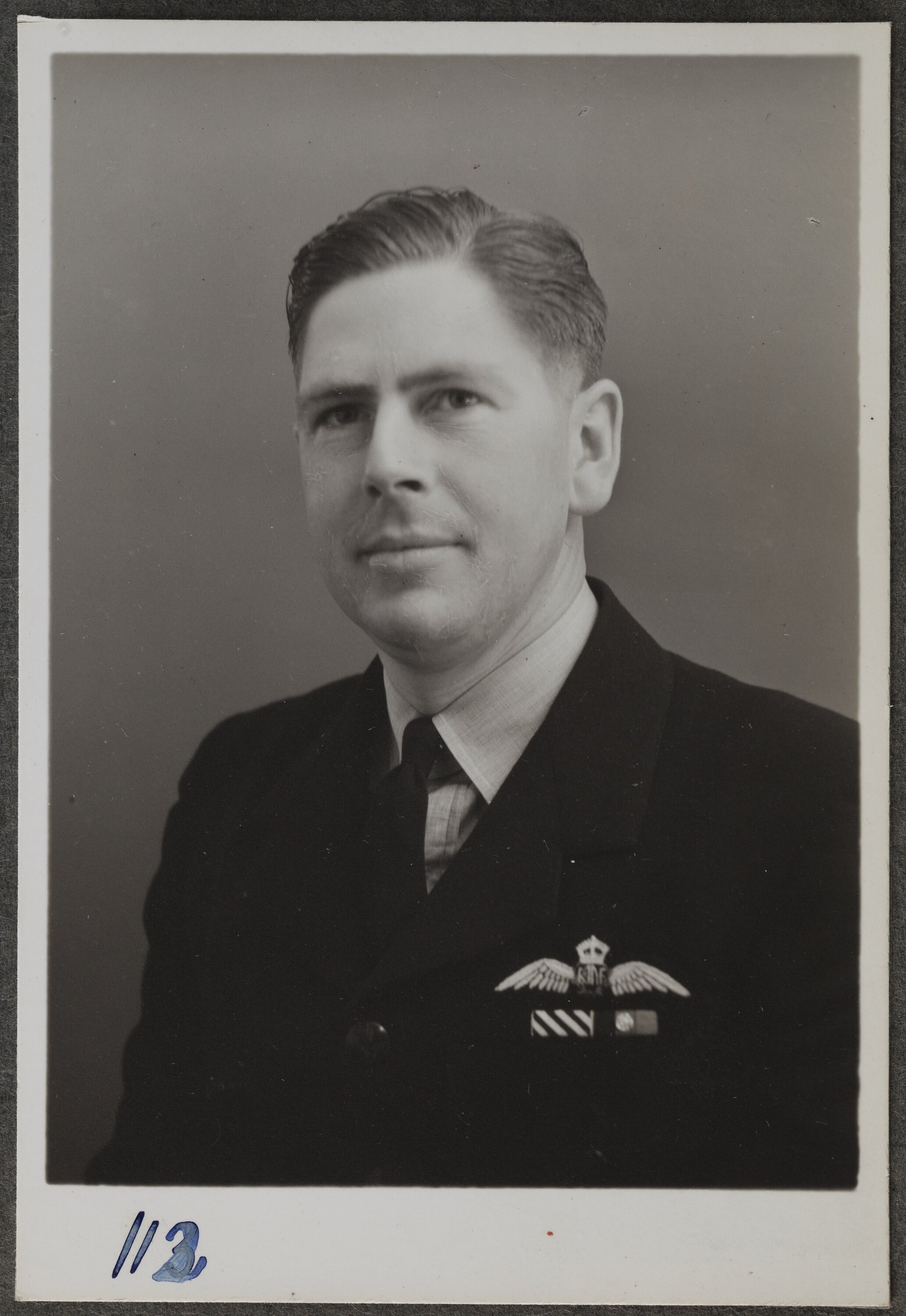 Photographic portrait of Squadron Leader H.B. Nicholls, Distinguished Flying Cross, on a visit to the Kodak factory at Abbotsford. 'Eagle Star Perth' is noted after his name in the album.