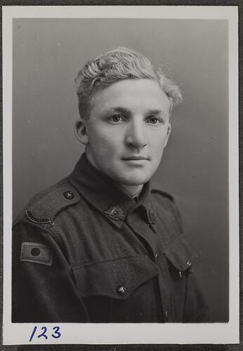 Photographic portrait of Private Stuart Reed of Abbotsford on wartime a visit to the Kodak factory at Abbotsford.