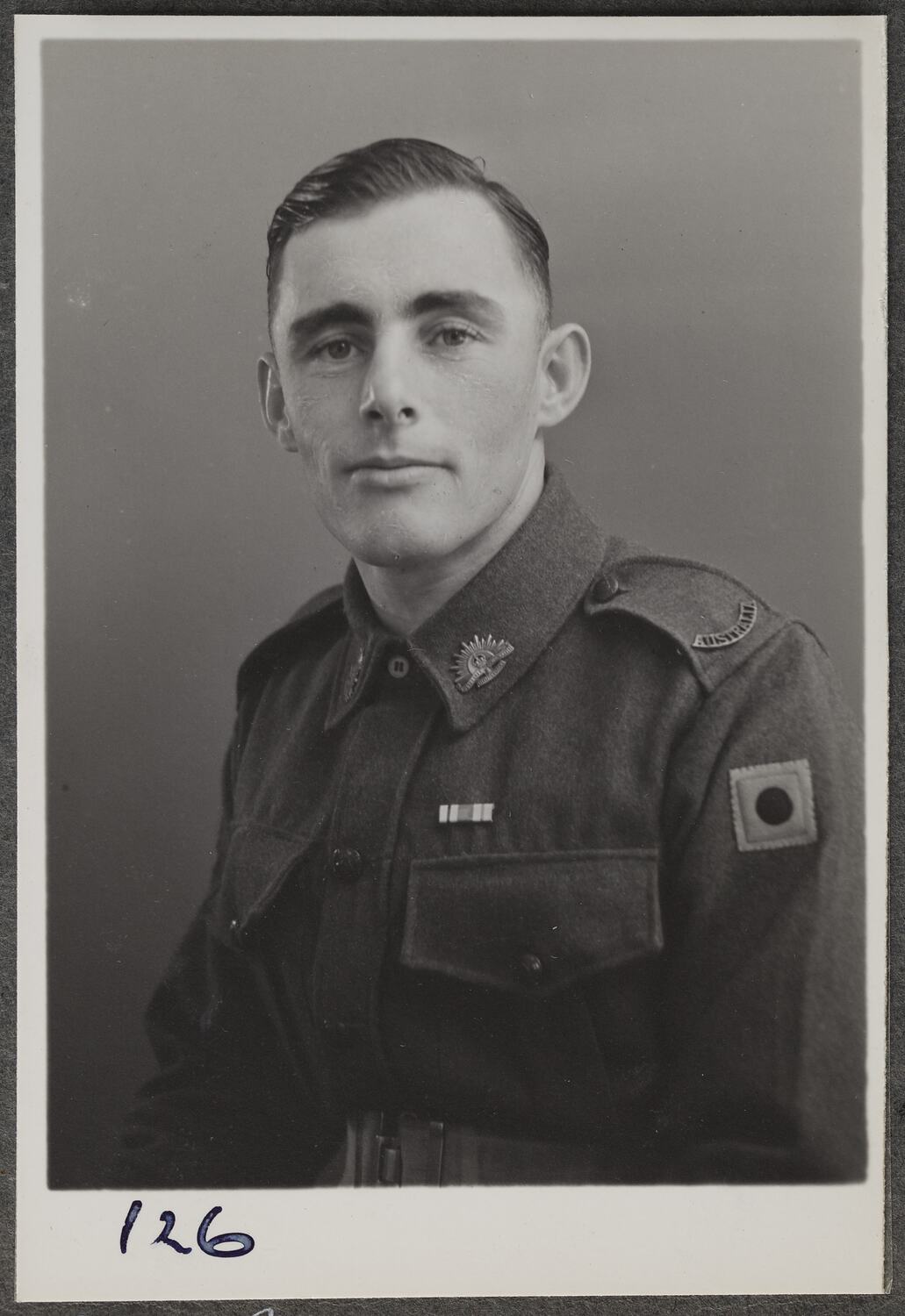 This is one of many portraits in an album of military and naval personnel who visited the Kodak Australasia Pty Ltd factory during World War II, 1939-1945.