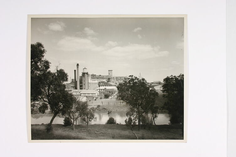 The photograph of the factory is looking west from across the Yarra River. It features the river and trees in the foreground and the factory in the background across the river. Chimneys and a variety of factory buildings are visible, as well as palm trees and gardens.