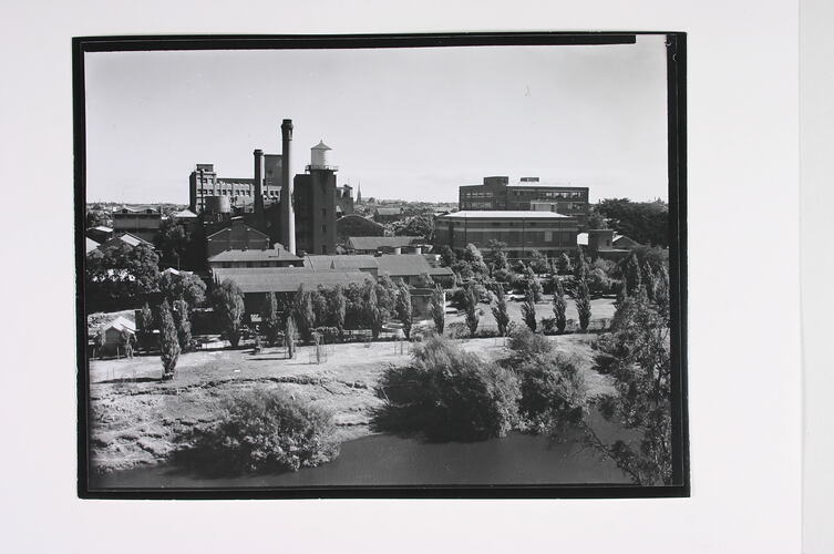 The photograph features a wide view of the factory site looking west from across the Yarra River, with the factory in the mid-ground, river bank, trees and river in the foreground, and suburban Melbourne in the background. The building closest to the trees in the foreground was used to manufacture silver nitrate for photographic products, by dissolving silver in concentrated nitric acid. The tanks are related to the silver recovery process. Behind this are the maintenance workshops. The building behind this at left with the water tank on top is part of the Power House. To the right, with the two chimneys is the Power House. This building provided all of the power and refrigeration for the factory. The shorter chimney was the original Power House chimney, which was removed by 1955. To the right of this with the water tank on top of the tower is the Paper Coating Building where photographic paper was coated and photographic emulsions were manufactured. The tank visible on the top of the tower of this building contained distilled water which was used in manufacturing. The tall building at the rear left, is the Number 6, Film Coating Building, where film products were made, and where the 'finishing' process and distribution took place. The tall building at the far right is the Kodachrome Building, which was constructed in the 1940s. Film was processed and paper prints were made here, and the research lab was also housed here. The smaller building in front of this is the Glass Plate Building, where glass plates were made. In the large garden area to the right, seats are visible for staff to sit on during their breaks.