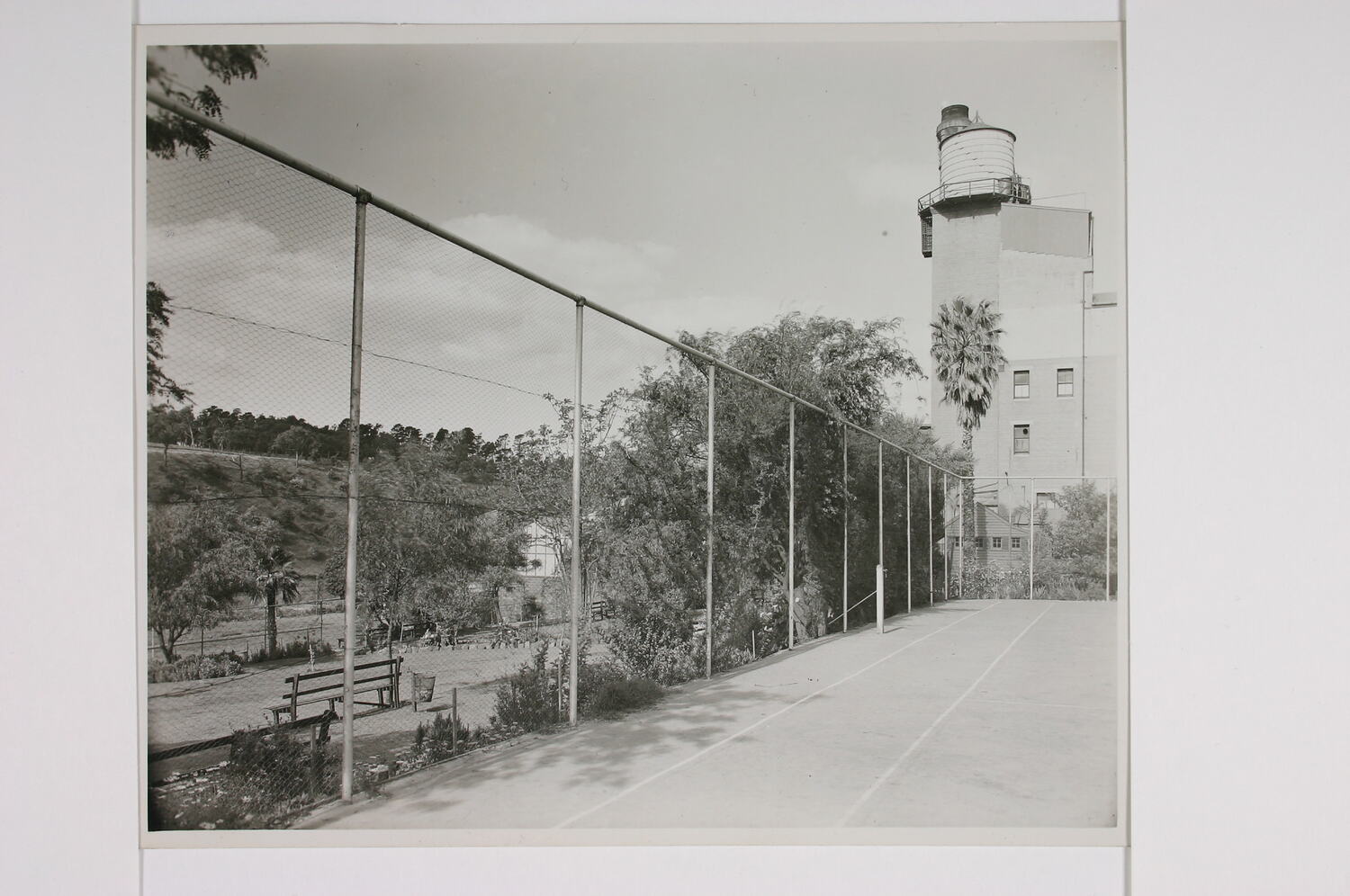 The photograph predominantly features the staff tennis court, with the fence running diagonally from the bottom left corner of the image to the right middle ground. To the left, outside the tennis court fence, looking east toward the Yarra River, there is a garden setting with garden beds, trees, lawn, a rubbish bin and garden seats. This garden area was close to the canteen and was where staff took their breaks. The 'Yarra Grange' building is not visible but was to the right of the tennis court. The tall tower in the background with the water tank on top was part of the Paper Coating Building, where photographic paper was coated and photographic emulsions were manufactured. The tank visible on the top of the tower of this building contained distilled water which was used in manufacturing.