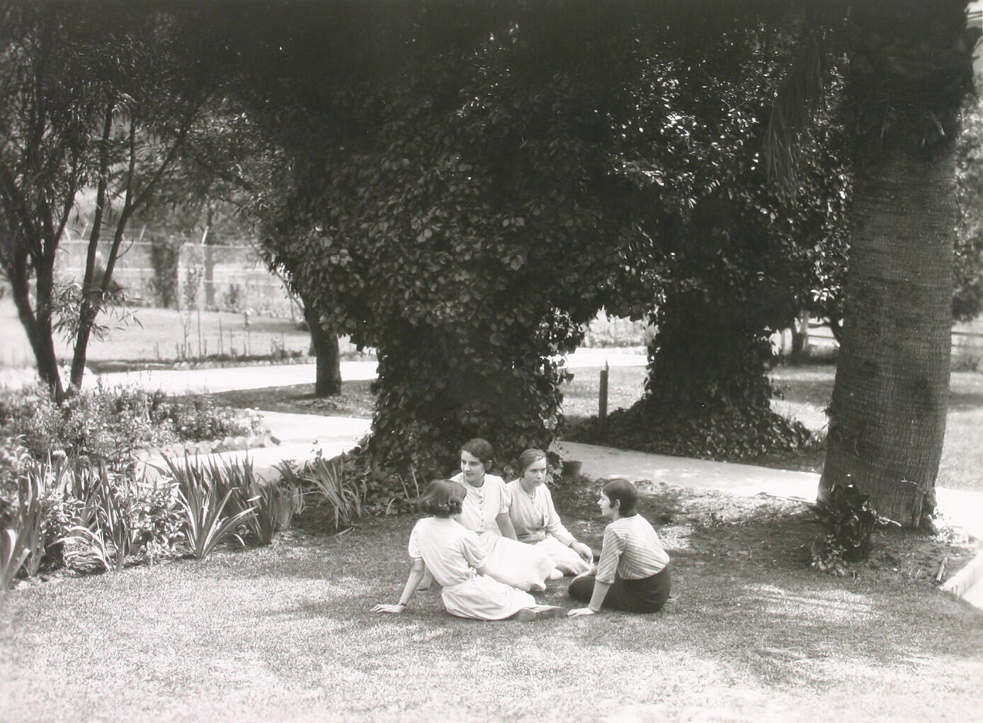 The photograph features four women sitting on a lawn, surrounded by garden beds and mature trees. There are tennis courts to the left in the background.