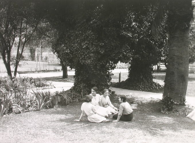 The photograph features four women staff members sitting on the lawn surrounded by garden beds and mature trees in front of the Yarra Grange house. The tennis courts are visible to the left in the background. This area was close to the canteen and staff took their breaks here.