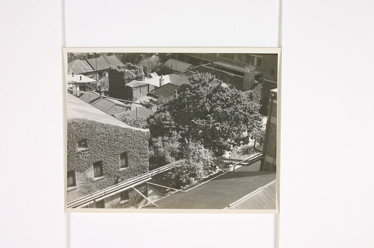 The photograph is an aerial view of several factory buildings and shows a system of pipes linking various building together. The pipes carried distilled water, chilled water, steam (the large lagged pipe) and brine (which was used to set the emulsion) to manufacturing buildings. The building in the foreground with ivy on the front is probably the Glass Plate Building where glass plates were made. The ivy covered building in the background of the photograph is thought to be the original 'Yarra Grange' house, which later became the management building and housed the director's dining room.