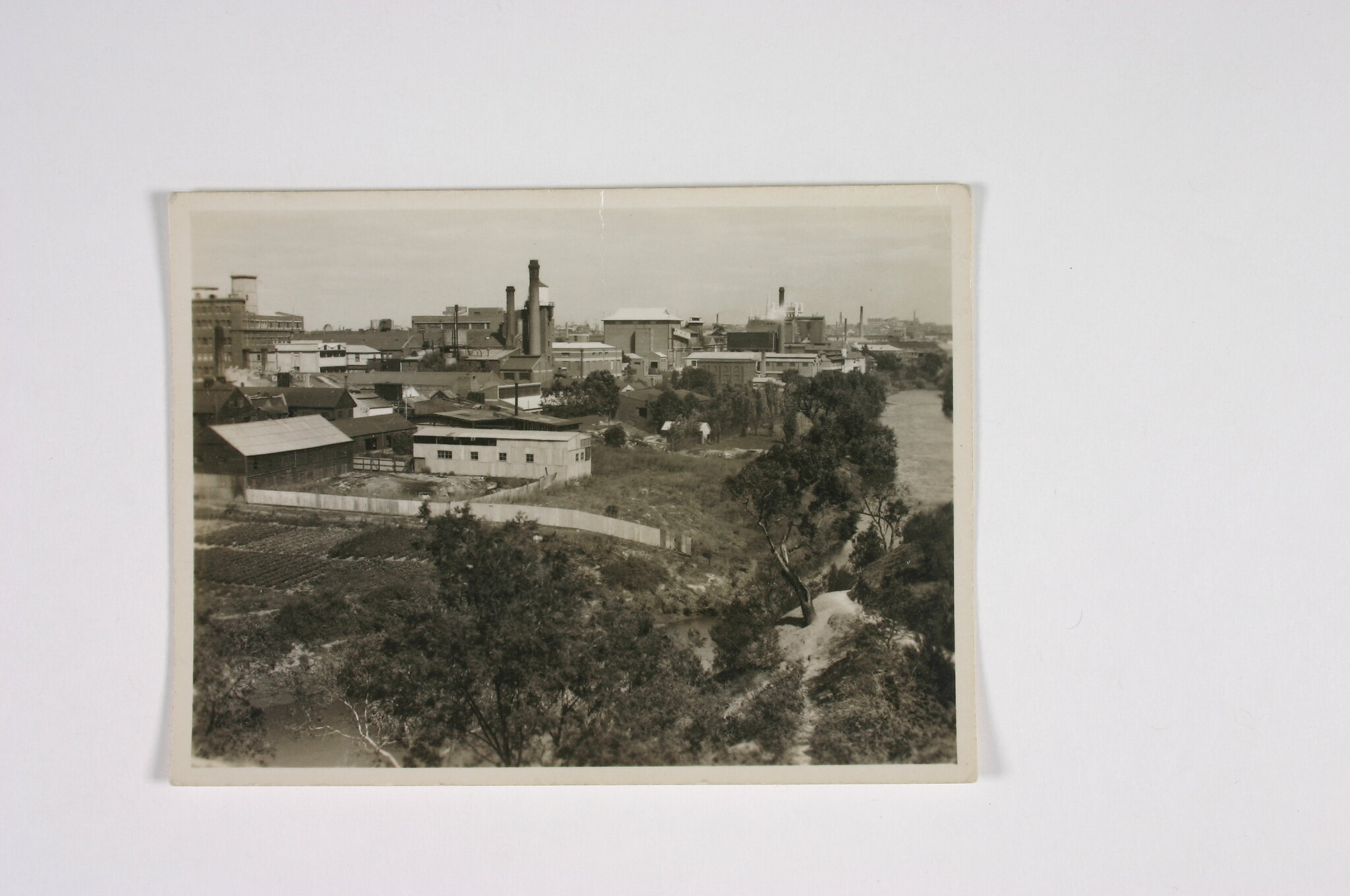 In the mid to background of the photograph, an extensive array of Kodak factory buildings can be seen, as well as two chimneys and a tower with a water tank on top. On the horizon other factory sites are visible. The Yarra River is on the right (eastern side) of this photograph. Market gardens are evident in the foreground, separated from the factory by a timber fence. The market gardens were possibly a Kodak initiative, grown on Kodak land, and made available for employees during World War II to grow vegetables. This would have helped sustain the employees as food was in short supply during this time. Alternatively, the gardens may have belonged to commercial Chinese market gardeners that operated nearby.