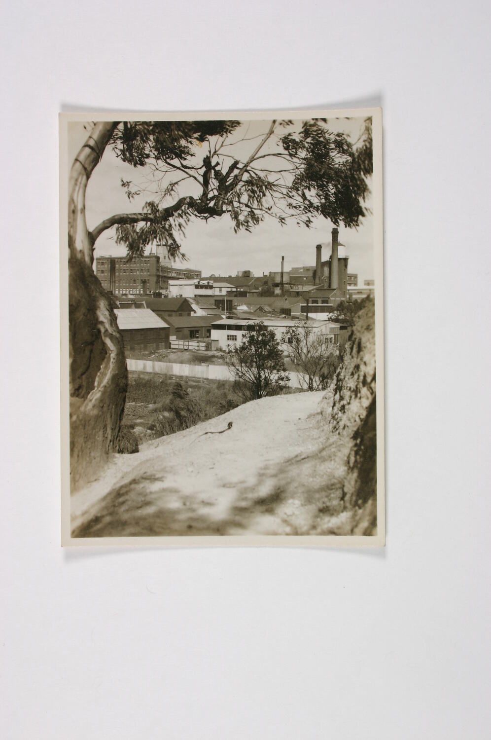 In the foreground is the eastern bank of the Yarra River, with a tree at left and a snake on the track. In the background are the buildings of the Kodak factory. At left is the Number 6 Film Coating Building, where photographic film was coated, 'finished' and distributed. At far right are the two chimneys of the Power House. The Power House provided all of the power and refrigeration for the Kodak factory. The taller chimney was the second chimney and was probably built in the 1930s. The original, shorter, chimney was removed by 1955. The tall tower adjacent to the Power House, with a water tank on top, is part of the Paper Coating Building where photographic paper was coated and photographic emulsions were manufactured. The water tank visible contained distilled water which was used in manufacturing. Market gardens are evident in the foreground, separated from the factory by a timber fence.