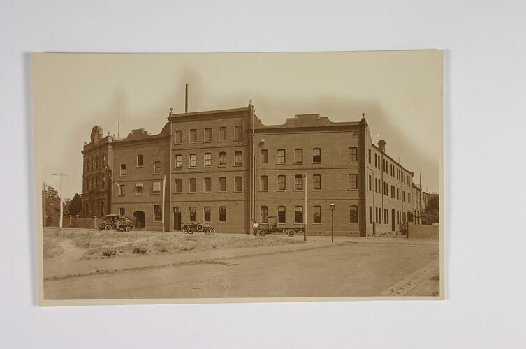 Exterior of a factory site. The view looks across at a three storey building from a road which is perpendicular to the building. Another road is parallel with the front of the building. Four of the five sections of this multi-storey brick building are visible in this photograph, as well as the side of the building at far right. In front of the building there is a Kodak delivery truck at left with a man standing in front, a car in the middle and a truck at right with a man standing in front, all parked on the road. A gas street lamp is on the corner of the two roads, and bluestone guttering lines the road in the foreground. A footpath is visible on the left, on the edge of a vacant block opposite the factory building.