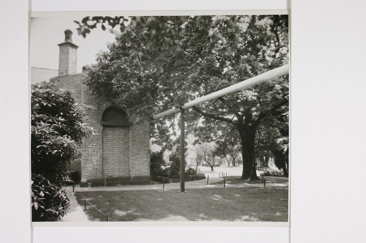 Photograph of a factory site. This photograph shows the north east corner of a cottage. A pipe carrying water for manufacturing extends from the cottage, and adjacent are gardens that feature lawns cordoned off with low rope fences, footpaths, shrubs, a large tree and park benches. There is a stained glass window in the archway of the cottage, and a chimney on the roof.