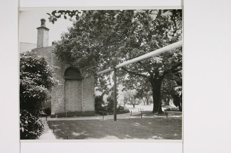This photograph shows the north east corner of Yarra Grange cottage, also known as 'the Cottage' or 'the old Cottage'. During this period this building housed the director's dining room. A pipe carrying water for manufacturing extends from the cottage. Adjacent are gardens that feature lawns, footpaths, shrubs, a large tree and park benches.