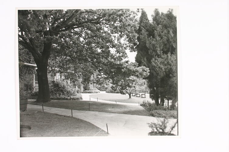 This photograph shows the front of Yarra Grange cottage, also known as 'the Cottage' or 'the old Cottage', and its gardens. The gardens feature manicured lawns and mature trees and shrubs, as well as park benches and footpaths. The gardens originally extended to the Yarra River on the eastern boundary of the property, and included a tennis court. The tennis court and most of the gardens were later lost when the Plate Department was constructed by Kodak around the 1940s.