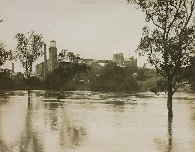 Taken from the north bank of the Yarra river, the photograph looks back south east across trees submerged in the water to the Kodak factory in the background. From left, the Kodak Power House with its chimney can be seen. The Power House provided all of the power and refrigeration for the factory. Adjacent to this is the Paper Coating Building, where photographic paper was coated and photographic emulsions were manufactured. The tank visible on the top of the tower of this building contained distilled water which was used in manufacturing. At right front is the Glass Plate Building.
