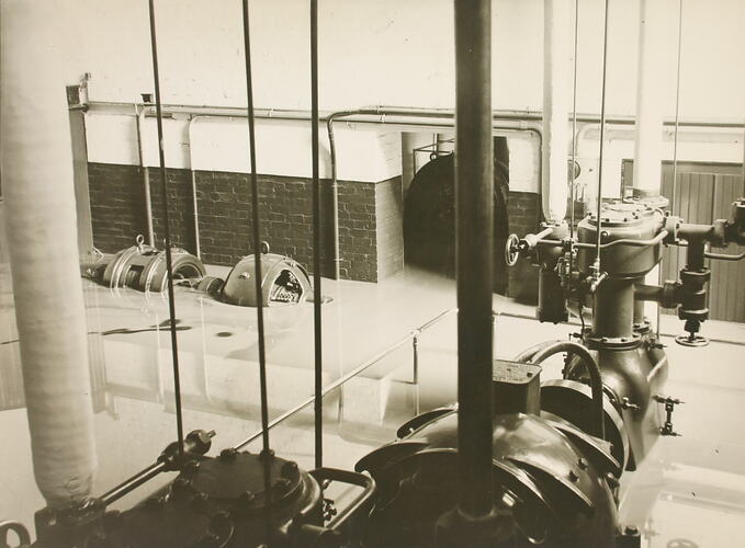 This photograph shows the interior of the Power House Building under water when the Yarra River was in flood in 1934. The Power House provided all of the power and refrigeration for the factory.