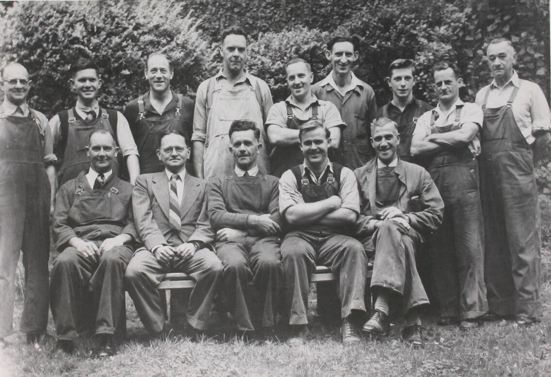 Group portrait consisting of two rows of men. Seven are seated at the front and eight are standing at the rear. They are mostly dressed in overalls, except for the man seated second from the left in the front row, who is dressed in a suit and tie. The photograph is taken in a garden. The men are located on a grass lawn and behind them is foliage from trees or shrubs.