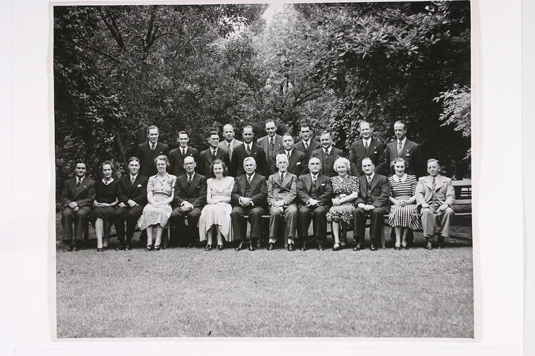 Black and white, silver gelatin photograph of members of the Accountants Conference, Kodak Australasia, Abbotsford, Victoria, 1948.