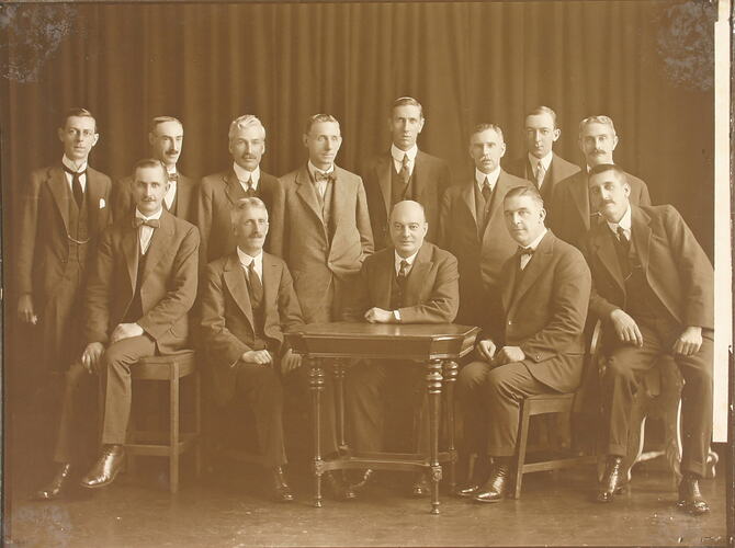 Black and white, sepia toned photograph of Kodak executive staff, Kodak Australasia, Abbotsford, Victoria, circa 1920s.