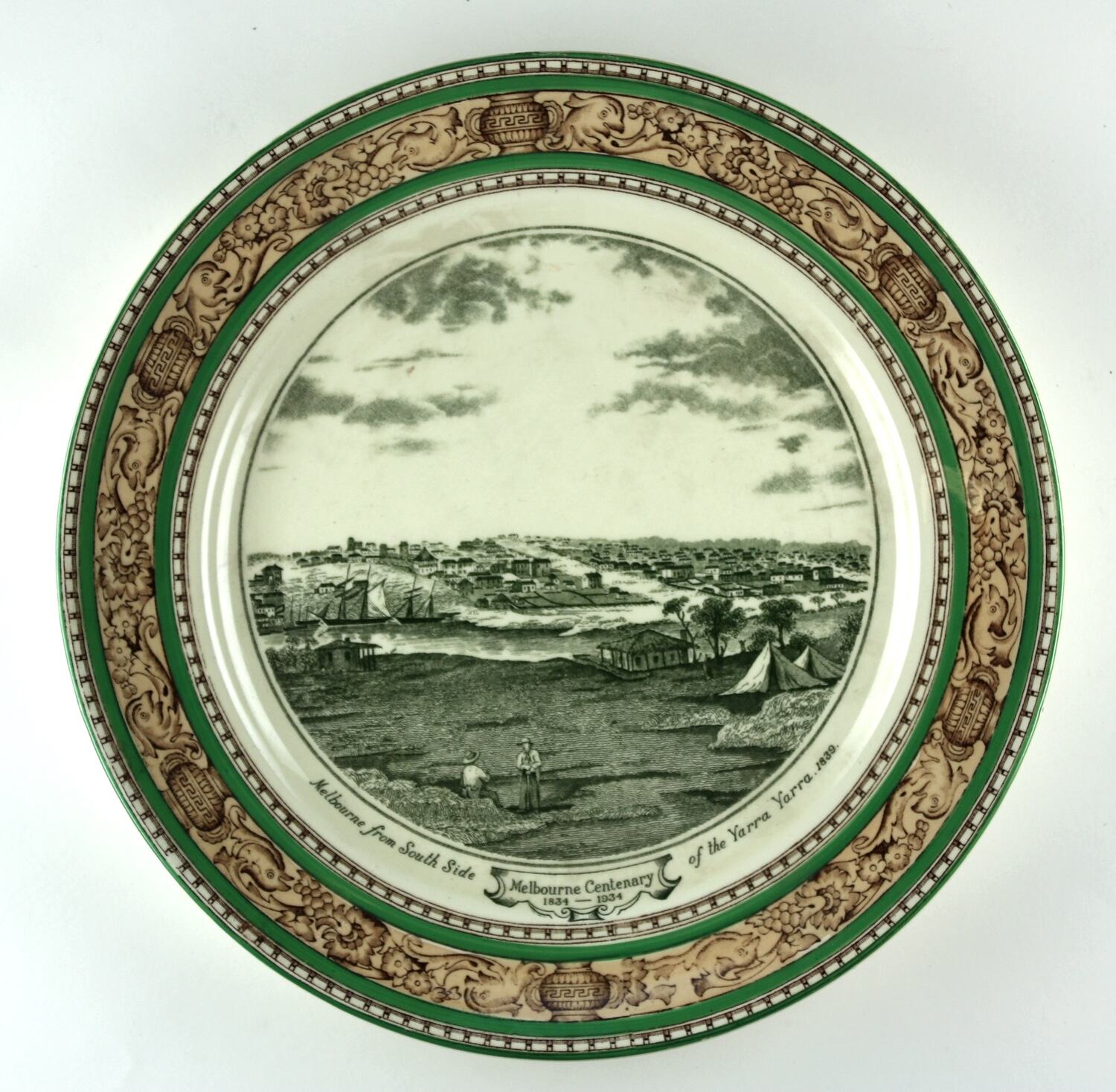 Ceramic glazed plate, transfer printed in green, depicting an idyllic view of early Melbourne from the south side of the Yarra river. The image shows a pair of figures, two small shacks and tents in the foreground, and two tall ships sailing westward down the river across the middle ground. Numerous low rise buildings can be seen on the north side of the river and well into the distance. The plate has a detailed decorative rim featuring a transfer printed pattern of dolphins, cornucopia and Grecian urns, with a hand painted green border.