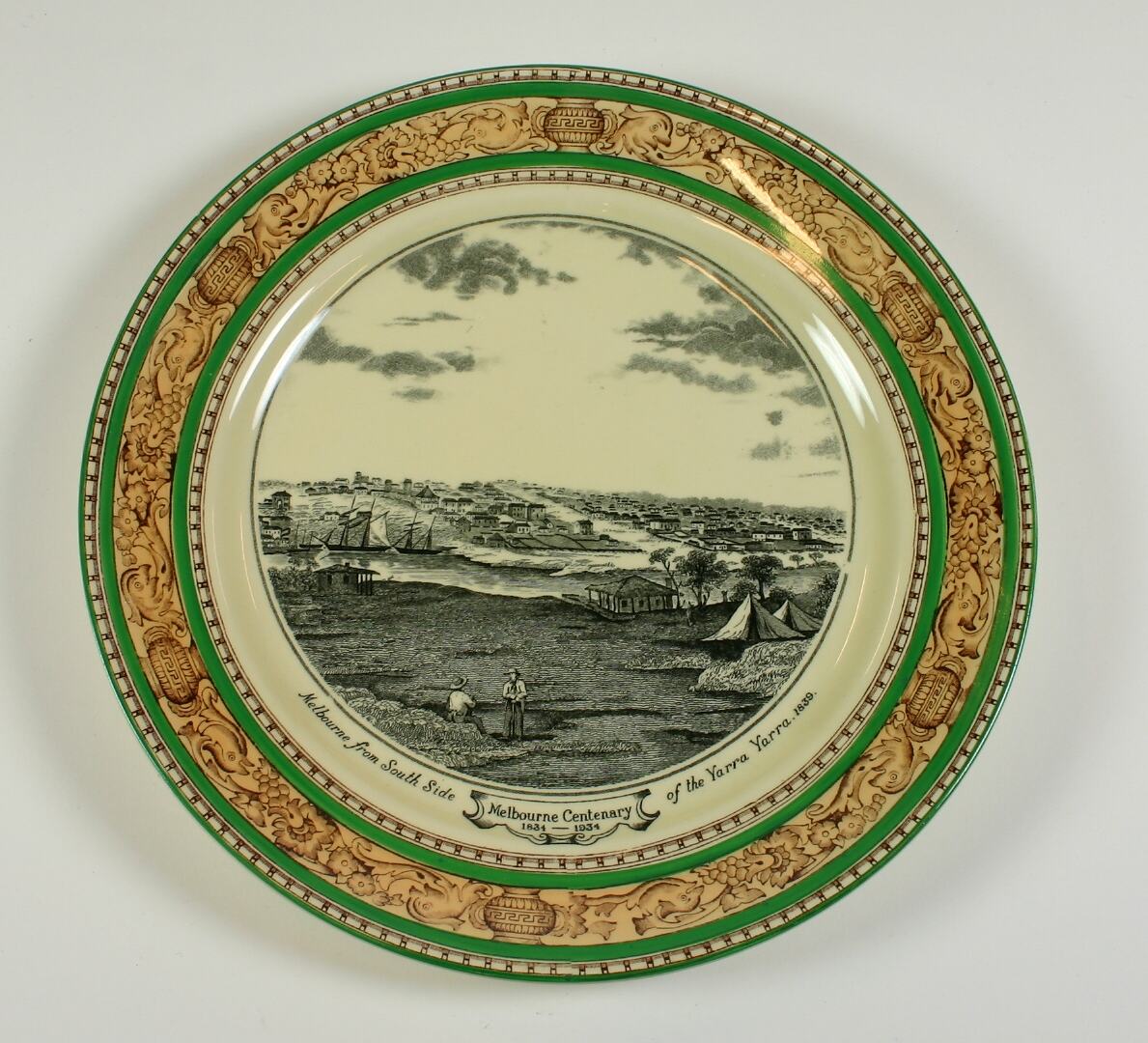 Ceramic glazed plate, transfer printed in green, depicting an idyllic view of early Melbourne from the south side of the Yarra river. The image shows a pair of figures, two small shacks and tents in the foreground, and two tall ships sailing westward down the river across the middle ground. Numerous low rise buildings can be seen on the north side of the river and well into the distance. The plate has a detailed decorative rim featuring a transfer printed pattern of dolphins, cornucopia and Grecian urns, with a hand painted green border.